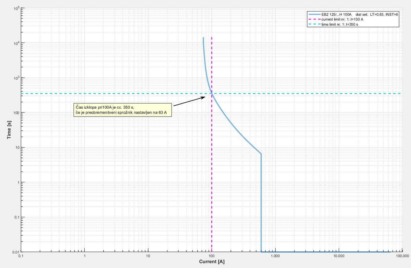 If we assume that the overload trip is set to 63 A, and an overload current of 100 A flows through it, the tripping time is approximately 350 seconds.
