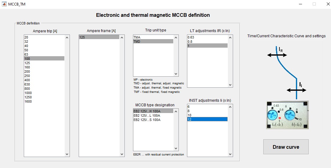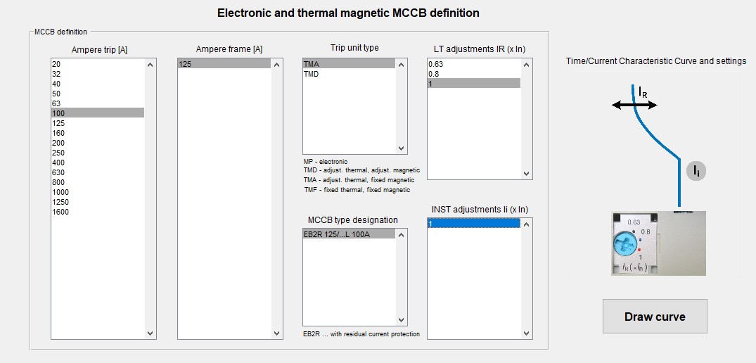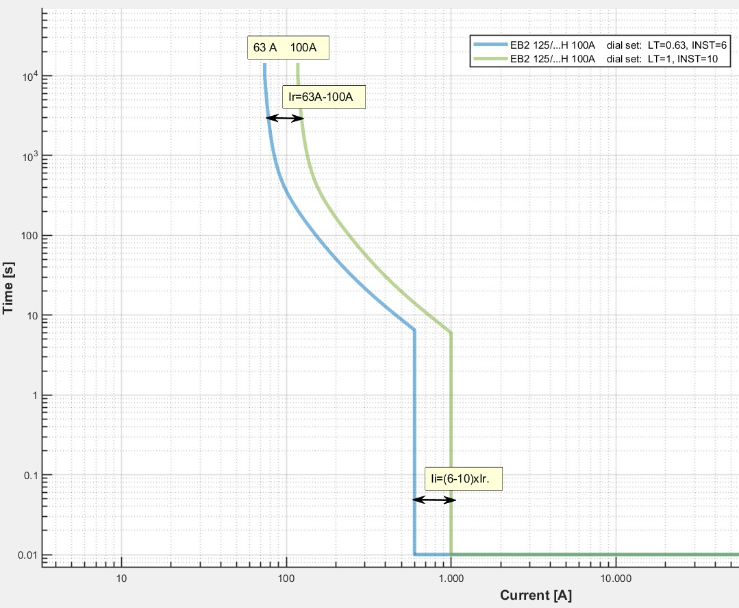 If we observe Figure 1 (our circuit breaker) and Figure 2, the characteristic values for the basic settings of the circuit breaker are as follows: